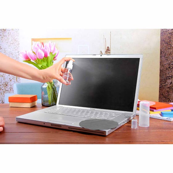 Atomizador con líquido limpia pantallas y microfibra de 12.5 cm de diámetro. El atomizador y la fibra se entregan por separado para su impresión.