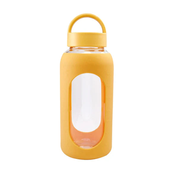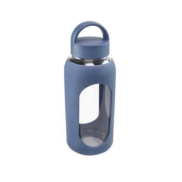 Cilindro de vidrio con manga de silicón graduada en ml. Tapa de plástico con sistema de rosca y asa. Vidrio resistente a bebidas calientes y frías. Incluye caja individual.