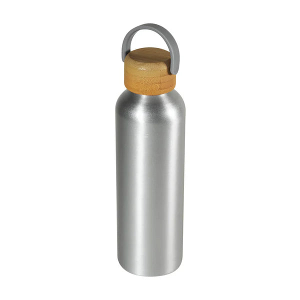 Cilindro metálico de una pared. Tapa de bambú con cierre de rosca y asa de plástico. Terminado mate. Incluye caja individual.