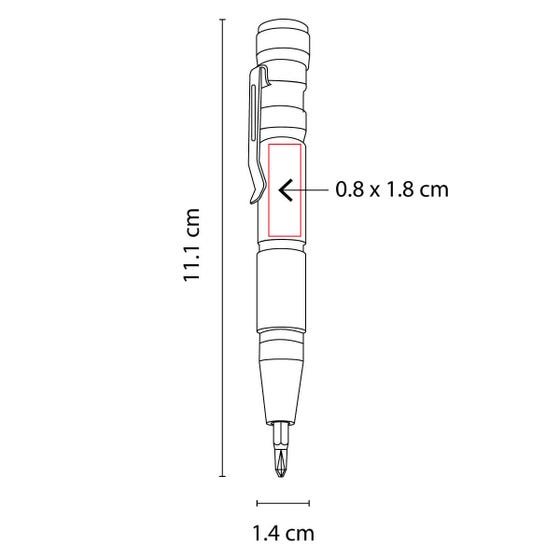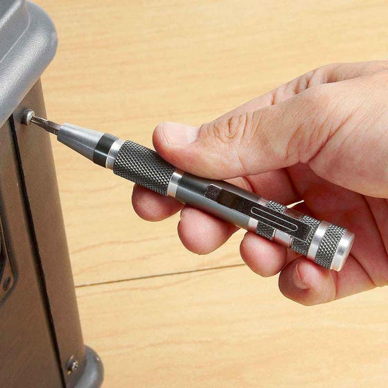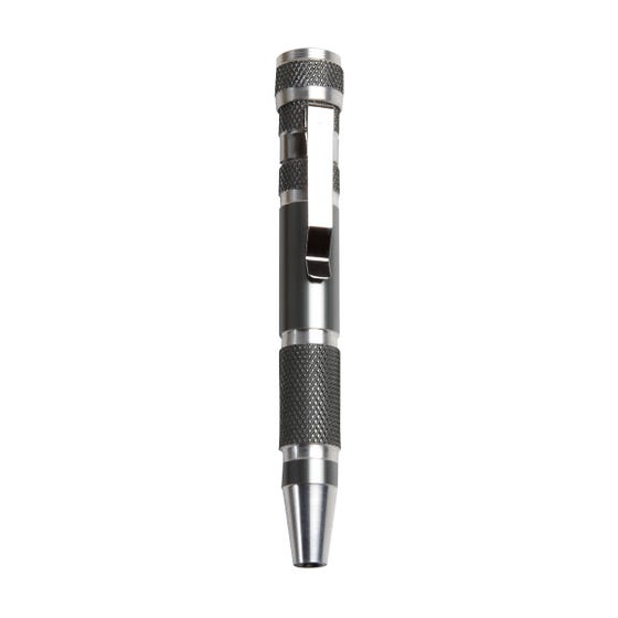 Desarmador de bolsillo con 4 puntas de cruz y 4 puntas planas diferentes e intercambiables. Incluye clip.