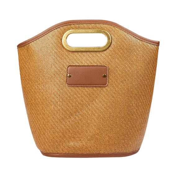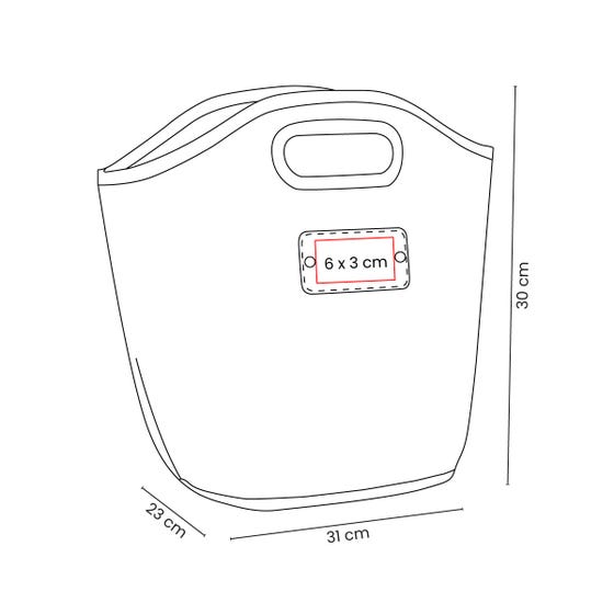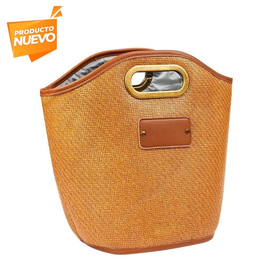 Hielera tipo bolsa con interior sellado plastificado. Compartimento principal con diseño abierto. Asas con marco de metal. Capacidad para 12 latas.