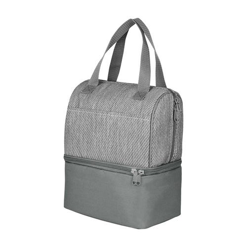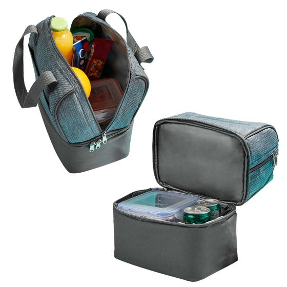 Interior plastificado. Compartimento superior e inferior con cierre y bolsillo frontal. Cuenta con 2 asas de agarre superior. Capacidad para 12 latas.