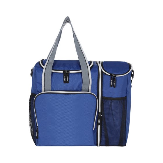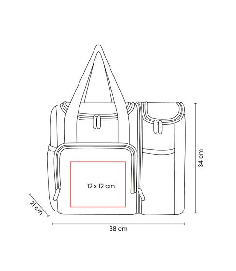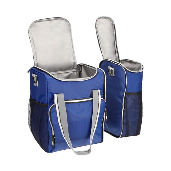 Doble compartimiento con cierre. Cierre intermedio que permite separar en dos piezas y usarlas de forma individual. Interior plastificado. Bolsillo frontal con cierre. Malla frontal y lateral. Correa ajustable. Identificador en la parte trasera.
