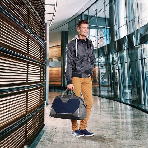 Bolsa principal con cierre, bolsa frontal. Compartimento lateral para zapatos y bolsa lateral. Incluye correa para hombro ajustable con broches de plástico y asas superiores.