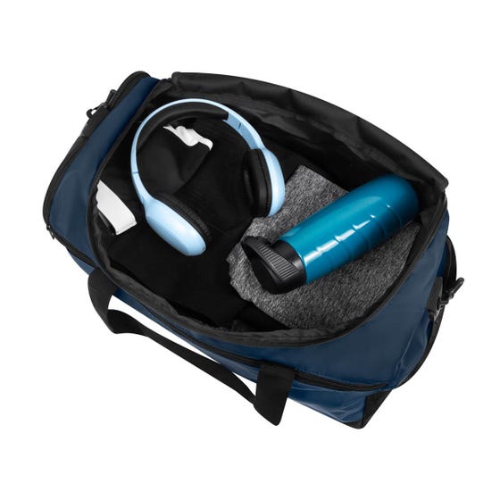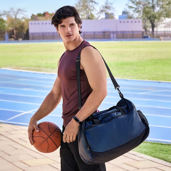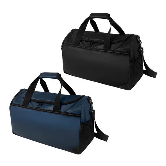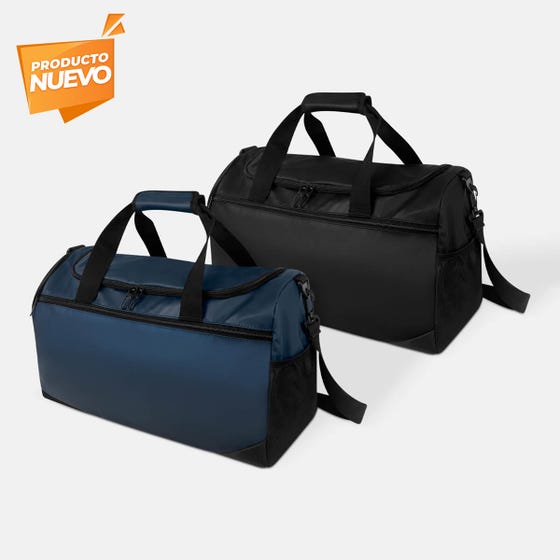 Práctica maleta con amplio compartimento principal y un bolsillo frontal con cierre. Cuenta con un compartimento lateral para calzado y un bolsillo lateral de malla para objetos pequeños. Incluye correa ajustable para hombro con broches de plástico removibles y asas de agarre superior. Perfecta para uso deportivo o viajes cortos