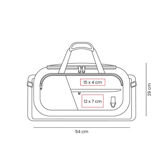 Maleta deportiva con bolsa principal y frontal con cierre que combina funcionalidad y estilo en un solo producto. Incluye accesorio para colgar llaves, compartimento para separar tu calzado, bolsillo lateral de malla, asas de mano y correa para hombro ajustable.