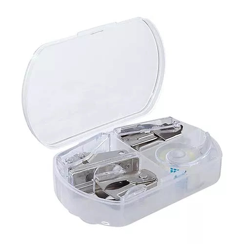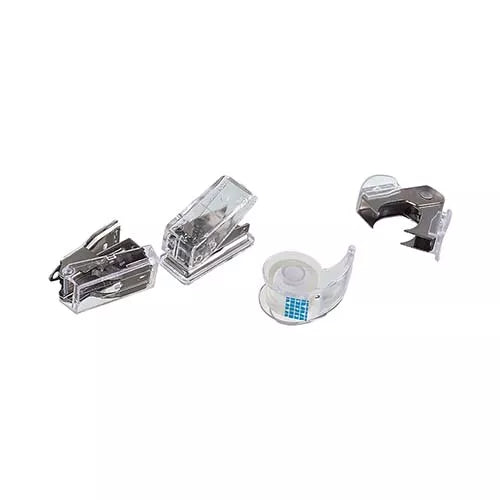Descripción | Mini kit de escritorio con engrapadora, perforadora, despachador de cinta y quita grapas. |