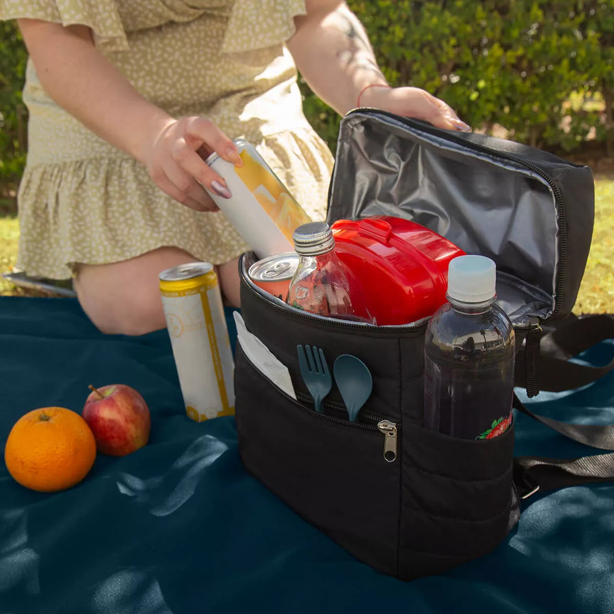 Descripción | Lonchera tipo mochila con asas, su diseno versatil permite llevarla como una mochila, facilitando su transporte. Cuenta con un bolsillo principal con cierre, que permite guardar los alimentos de manera segura y organizada. Incluye un bolsillo frontal con cierre, ideal para llevar utensilios o articulos pequenos. Tambien cuenta con dos bolsillos laterales, adecuados para llevar botellas de agua u otros objetos de acceso rapido. Capacidad para 12 latas. |