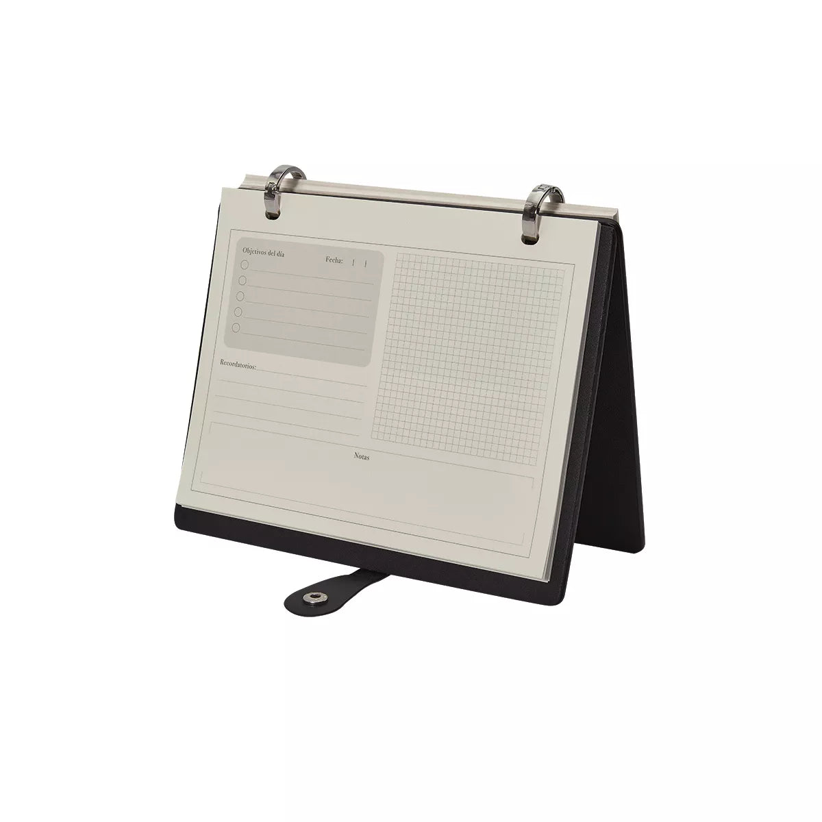 Descripción | Libreta con planeador para organizar actividades diarias. Incluye dos aros metalicos, boton de presion y 60 hojas de 100 gr. |