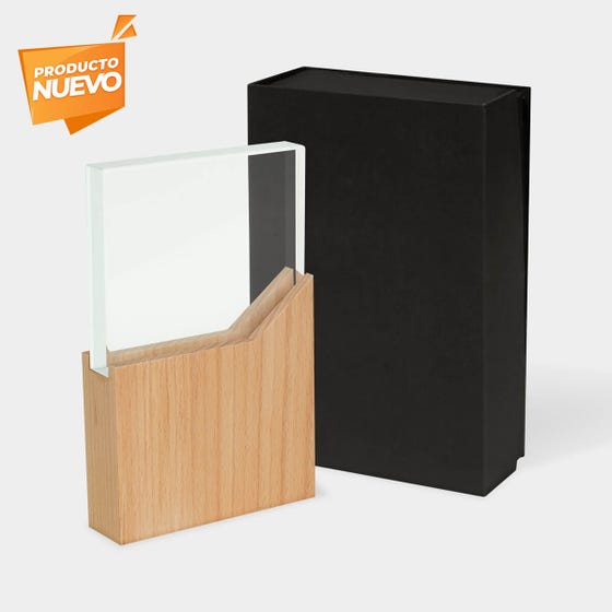 Elegante y clásico reconocimiento que combina vidrio y madera de pino. Perfecto para destacar los logros y celebraciones especiales. Incluye caja de regalo con broche imantado para cerrar y esponja interna para protección. La madera es un producto natural el cual puede presentar variaciones en tonalidades y vetas