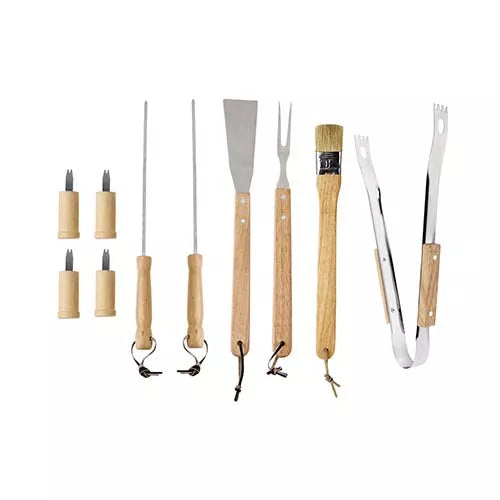Descripción | Maletin con cierre y correa ajustable. Incluye pinzas, brocha, tenedor, espatula, 2 brochetas y 4 pinchos para mazorcas. |