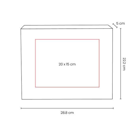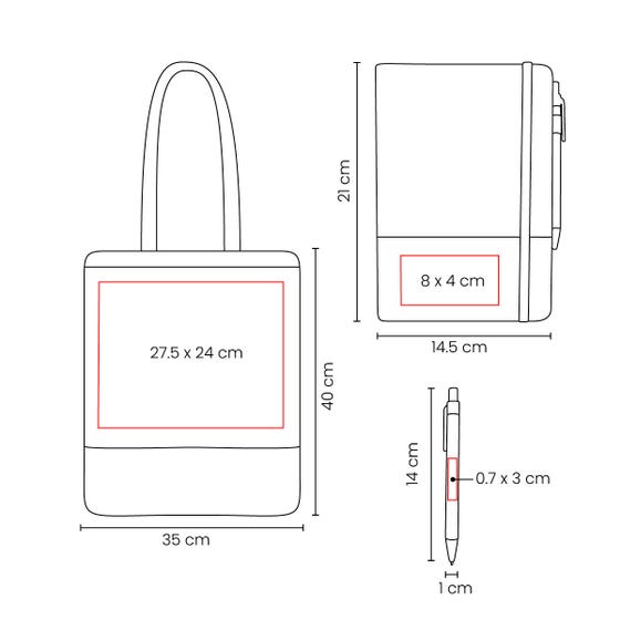 Área | 20 x 15 cm Caja / 27.5 X 24 cm Bolsa / 8 x 4 cm Libreta / 0.7 x 3 cm Bolígrafo |