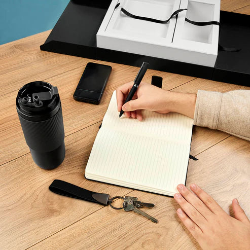 Exclusivo set de regalo. opcion perfecta para un obsequio de alto valor y calidad. este set viene en una elegante caja negra con solapa de abertura central, lo que no solo proporciona un acceso facil al contenido, sino que tambien anade un toque sofisticado al diseno. el interior de la caja presenta un color neutro que realza el aspecto general, creando un hermoso contraste con el exterior negro. incluye termo con doble pared metalica, cerrado al vacio, tapa con sistema de rosca, sobretapa de push y ranura especial con tapon para popote, tambien incluye popote metalico con boquilla de silicon. libreta de 80 hojas de raya, cubierta rigida de curpiel, separador interno y broche magnetico. boligrafo metalico con sistema twist y terminado rubber. llavero metalico combinado con curpiel, aro con giro de 360°. bateria auxiliar para smartphone de 10,000 mah, incluye 2 puertos usb, 1 micro usb y 4 leds indicadores de carga.